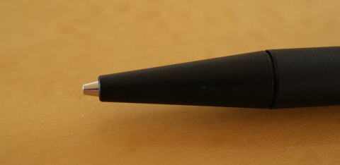From the long trapezium that is the pen’s tip, (strictly speaking a truncated cone) a silver nib extends only slightly.