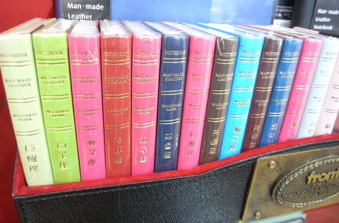 再び小さなブースの通路に戻り、歩いていくとつきあたりの所にいろいろなカラーのハードカバーノートを展示しているブースがあった。
